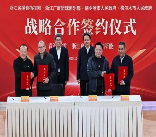 本场比赛中场休息时刻,浙江省援青指挥部、青海省德令哈市人民政府、青海省格尔木市人民政府与浙江广厦篮球俱乐部进行了战略合作签约仪式。四方共同签署合作书,并互赠礼物合影留念。