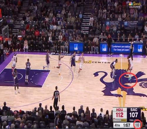 第三次也是漏判,发生在距离第四节结束还有28.4秒,杜兰特在创造空间时移动中枢脚,这是一次漏吹的走步违例,火箭获利,国王吃亏。