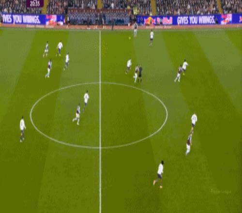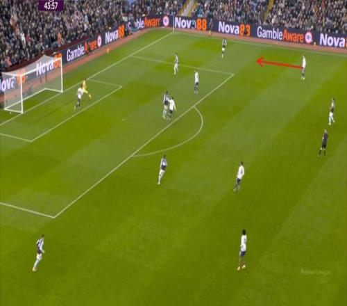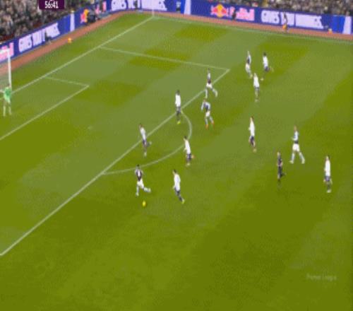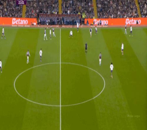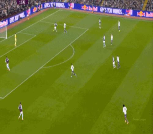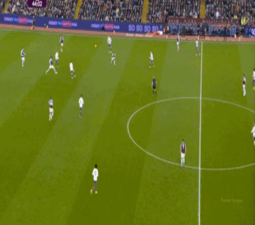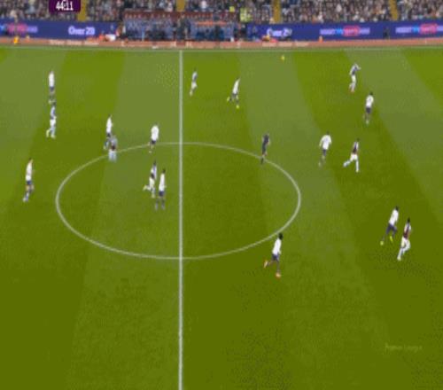 包括第二球也是一样,前戏依旧是维拉吸引曼联压迫,然后用长球连接前场,还是拉出空当之后,由麦金带出转移到弱侧的进攻:
